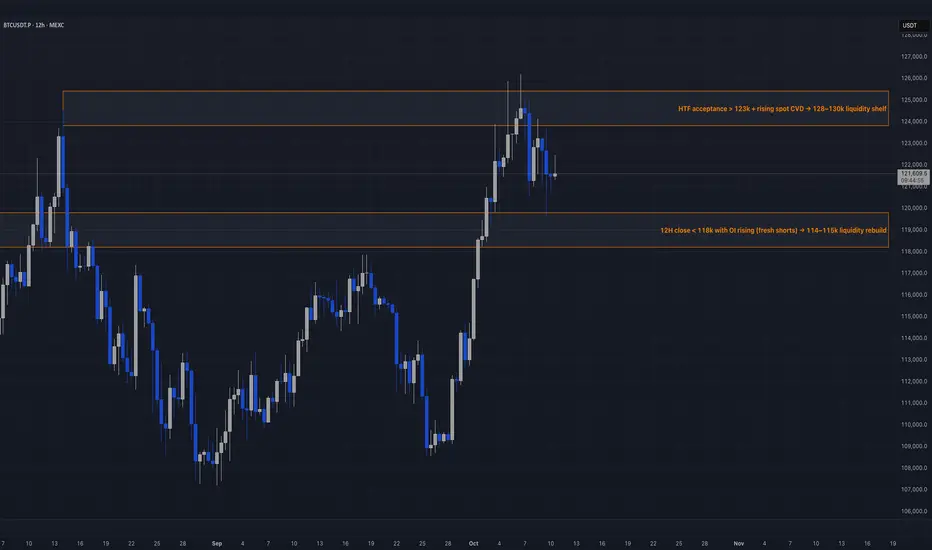 • 12H close < 118 k with rising OI and funding neutral / negative → shorts push → 114–115 k rebuild.