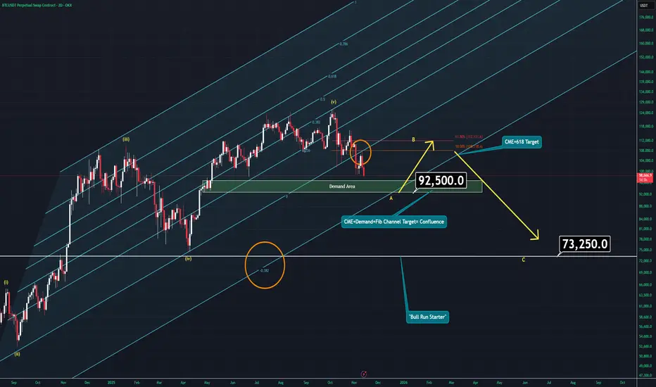 You will see a correction through 110K soon but it will only be wave B. So, if you're carrying long-term hedge positions, you'll need to watch for an ENGULFING daily candle in Bitcoin around 92K. That's where the CME gap was left — also a demand area and moreover, there is Fib channel confluence. Before that “engulf” happens, I'd not suggest lowering breakeven in losing positions.