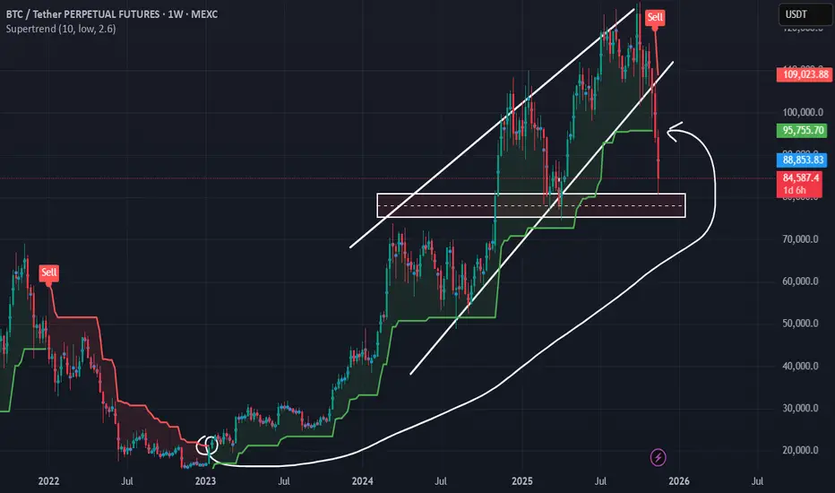 This is the zone BTC is likely to **test and re-test** while the weekly Supertrend stays bearish.