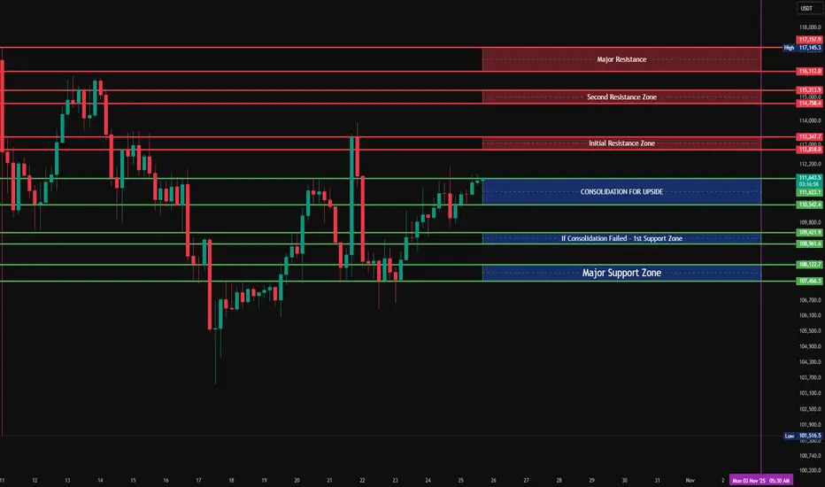 This “Consolidation for Upside” zone marks a pivotal decision area. Sustained acceptance above $111,600 will likely confirm strength continuation toward the Initial Resistance Zone ($112,818 – $113,347), setting the stage for a possible breakout sequence toward the higher resistance layers at $114,758 – $115,313 (Second Resistance) and $116,112 – $117,157 (Major Resistance).