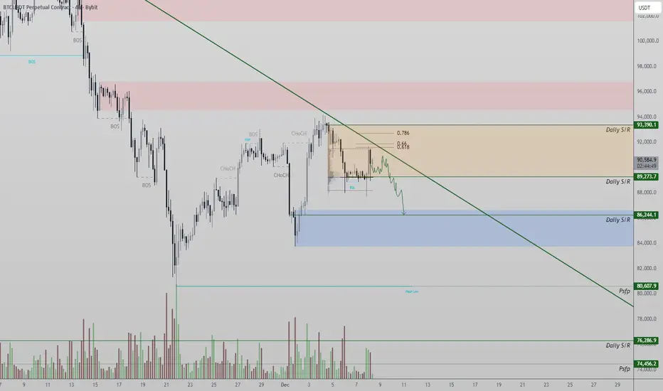 BTC is sitting above a key level at $90,000 after rejecting from the 0.618 Fib, which aligned with the value area high and dynamic trendline resistance.