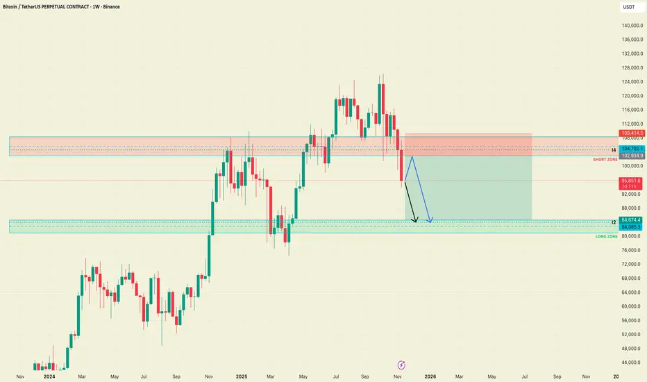 Either the price directly drops to $84,085, or BTC makes a pullback to values between $102,934 and $104,702, from where I would look for a short position towards $84,674.
