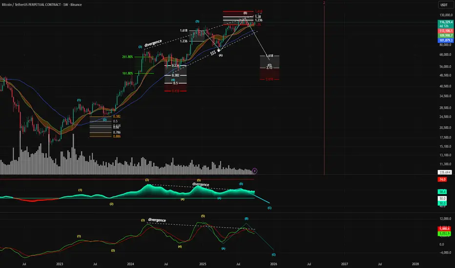 • Significant Bearish Divergence (Crucial Point): This is one of the most compelling signals on the chart.While the price is making higher highs (from the peak of wave (5) to the peak of wave (B)).Both the RSI and the MACD indicators are showing lower highs. This is a classic, multi-indicator bearish divergence on a high timeframe (weekly), indicating that the upward momentum is weakening significantly and a trend reversal is becoming more likely.