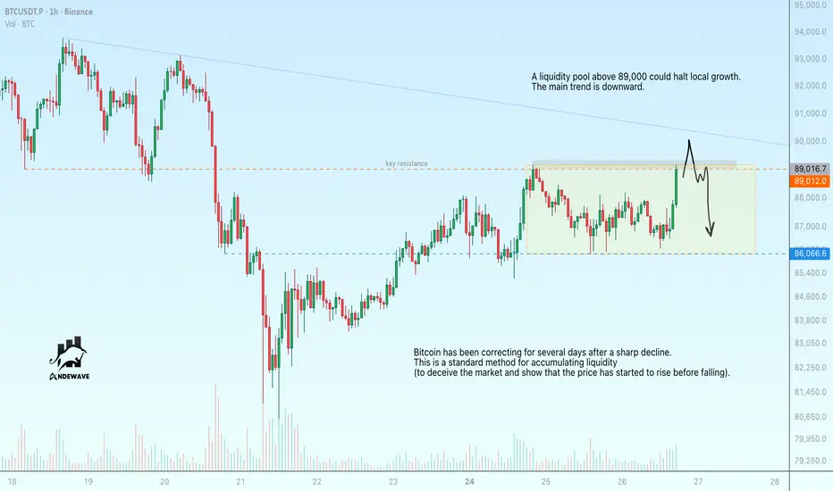 A liquidity pool above 89,000 could halt local growth. The main trend is downward.