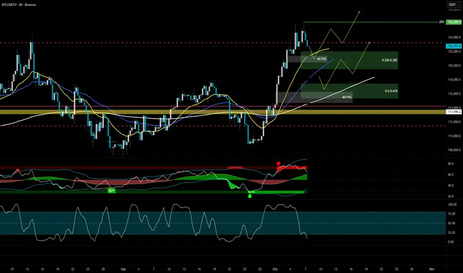 BTC 8H chart - bullish fibonacci pullback zones for resersal