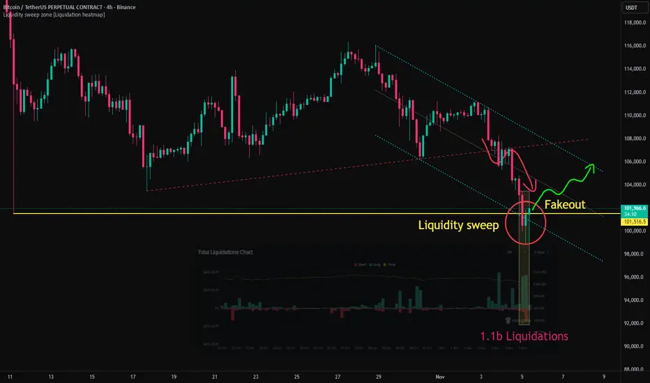During the eight-hour period of this decline, approximately 1.1 billion USD worth of long positions were liquidated, accompanied by both a liquidity sweep and a fakeout pattern.