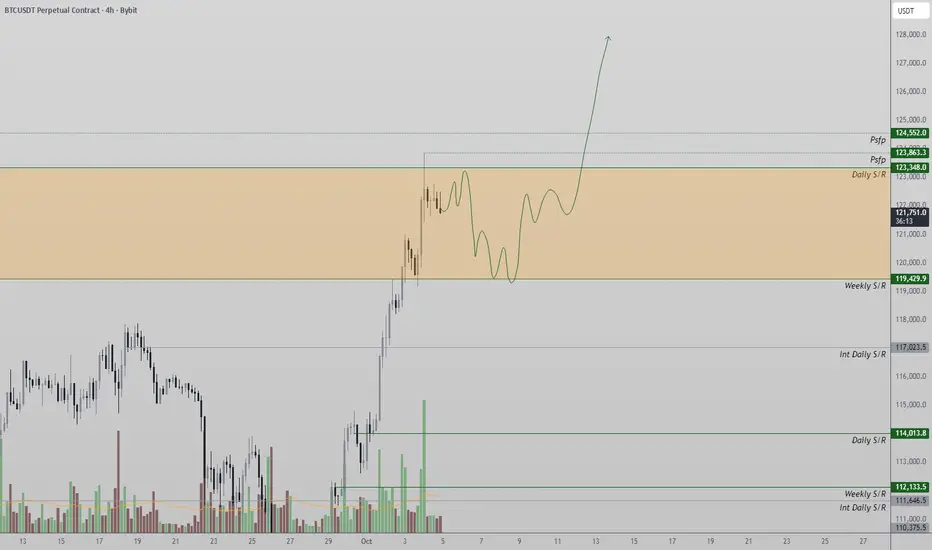 The current focus is on the $123,348 resistance zone. A decisive reclaim above this level would likely lead to a strong impulsive move toward $133,000 — the next key resistance and potential new all-time high. The move would mark a continuation of the bullish market structure that has been developing since the last significant correction.