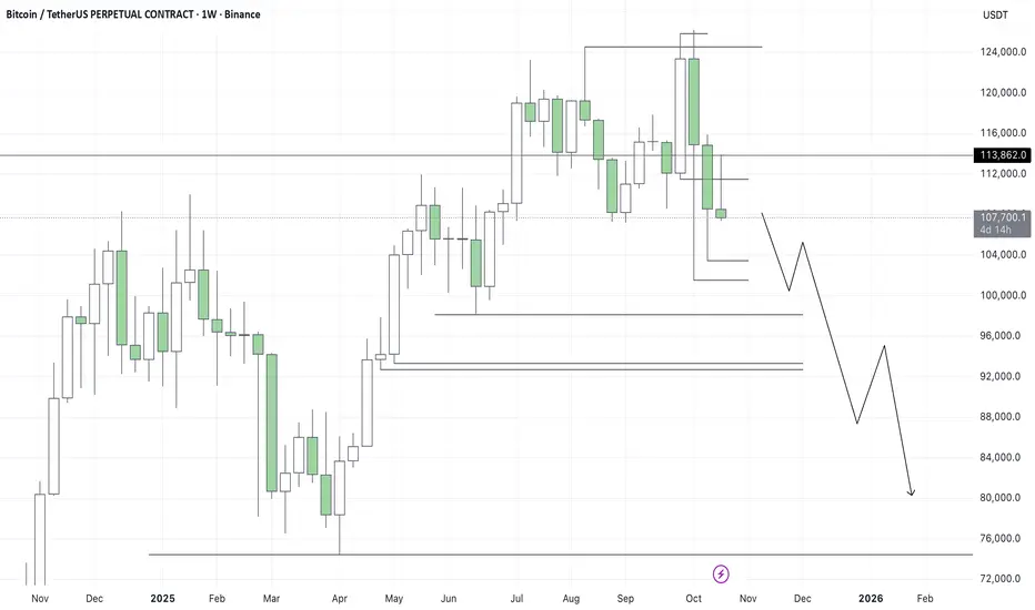 Bitcoin is currently trading around $108,000, and the structure still looks bearish — meaning lower prices are still possible. 🐻