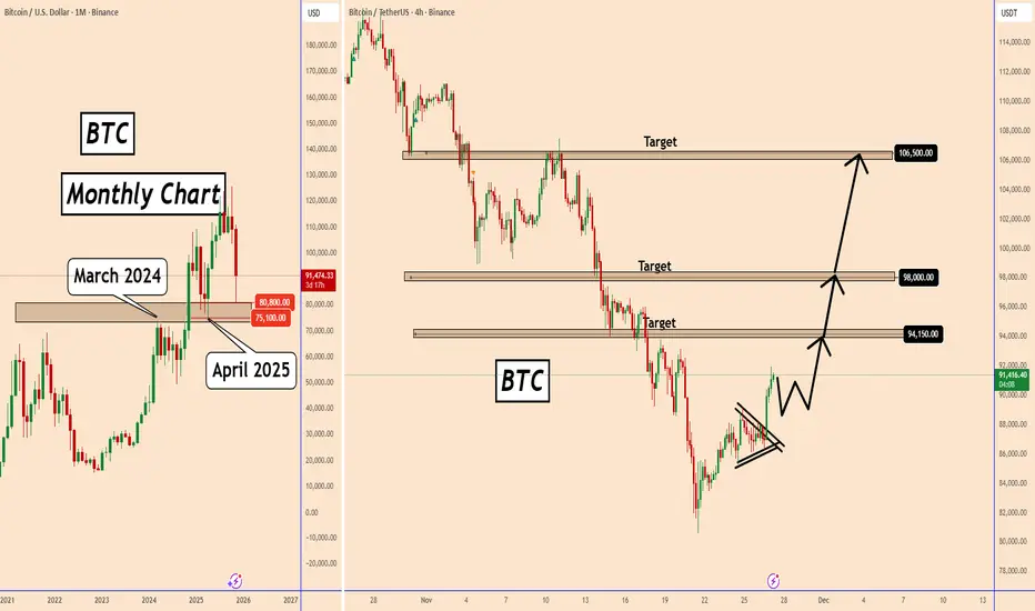 Bitcoin has reached a major long-term support zone between 75,100 – 80,800, an area that previously acted as strong support in March 2024 and April 2025 on the monthly timeframe.