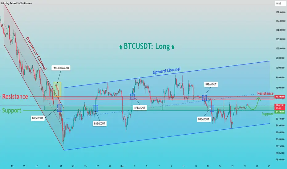 BTCUSDT recently transitioned from a strong downward channel into a broader bullish recovery phase. After a prolonged bearish move, price formed a base near the channel low, where selling pressure weakened. This led to a breakout from the downward channel; however, the first move above resistance resulted in a fake breakout, indicating that sellers were still active at that level. Following this, Bitcoin found strong demand around the 87,000 Support Zone, where buyers stepped in aggressively. From this area, price began to form higher lows and successfully established an ascending (upward) channel, signaling a shift in short-term market structure toward bullish control. Within this upward channel, BTC experienced several clean breakouts above intermediate resistance levels, confirming improving momentum. The key horizontal level around 90,300 acted as a major resistance, where price was rejected multiple times. Despite these rejections, the market did not break down sharply, suggesting absorption of selling pressure rather than distribution.