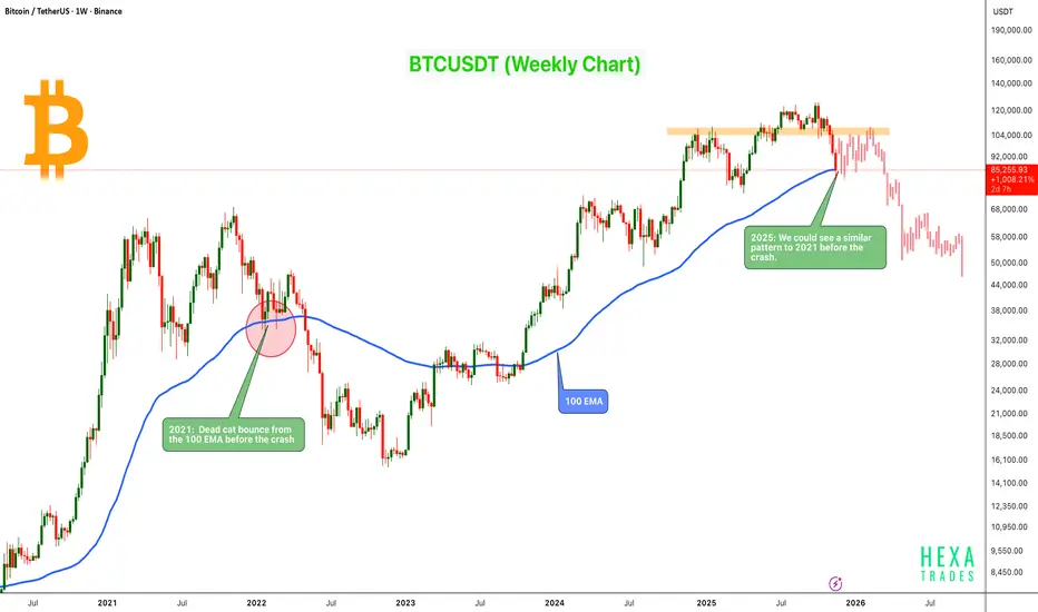 Bitcoin is showing a price structure very similar to the 2021 macro top, where BTC formed a dead-cat bounce from the 100 EMA before beginning a major correction.