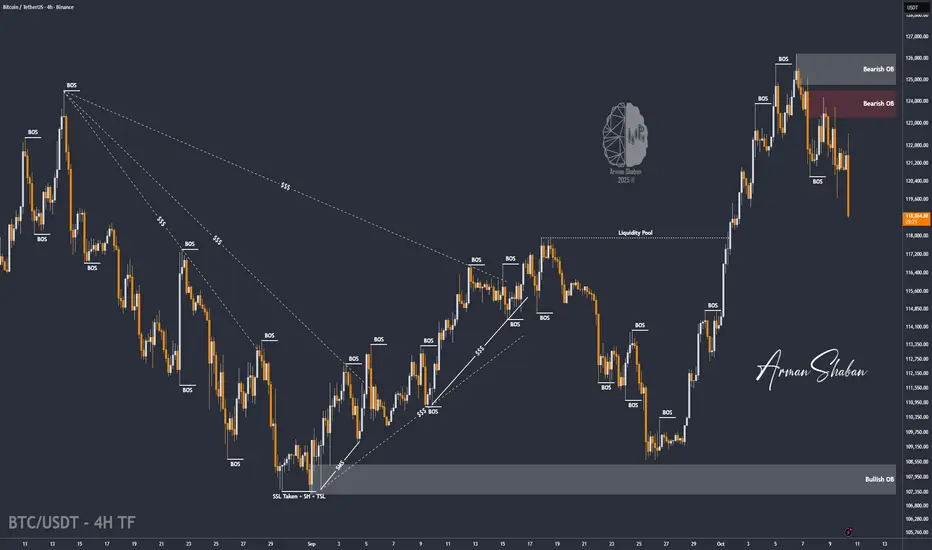 By analyzing the Bitcoin (BTC) chart on the 4-hour timeframe, we can see that after rallying up to $126,000 and setting a new all-time high (ATH), the price faced a sharp correction and is now trading around $119,000.