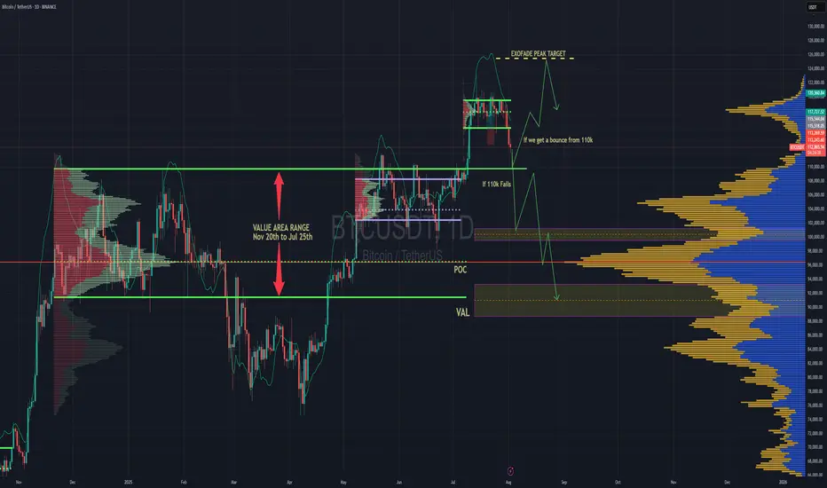 The Value Area High at 110k price range is most important upcoming battle line between bull vs bear. If bulls fail to get a strong bounce from 110k and we close at least 2 daily candles below it. Then it would mean bears have full control and the implication of that is that since we would at that point be closing back inside an established Value Area range, formed between Nov 20th to Jul 25th, then it would mean the probability of price selling all the way down to re-test the VAL (value area low) at $91.6k would instantly become very very high.