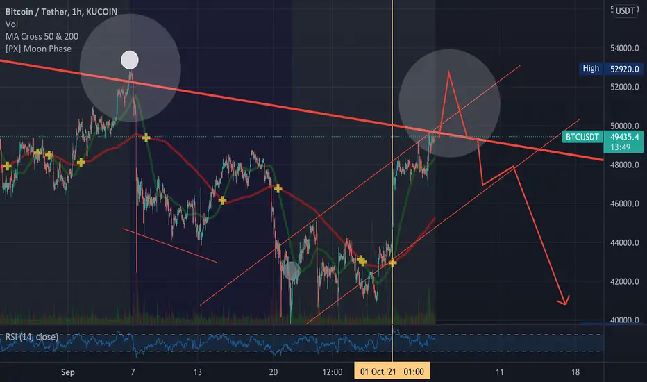 BTC almost always peaks close to the new moon and hits a low around full moon. Last new moon ,the high was hit just 2 hours after new moon and then fell sharply. This new moon is especially powerful because we have Mars exactly conjunct the new moon and Uranus very closely aspecting as well. You can see how the pattern being built last new moon is quite similar to this one.