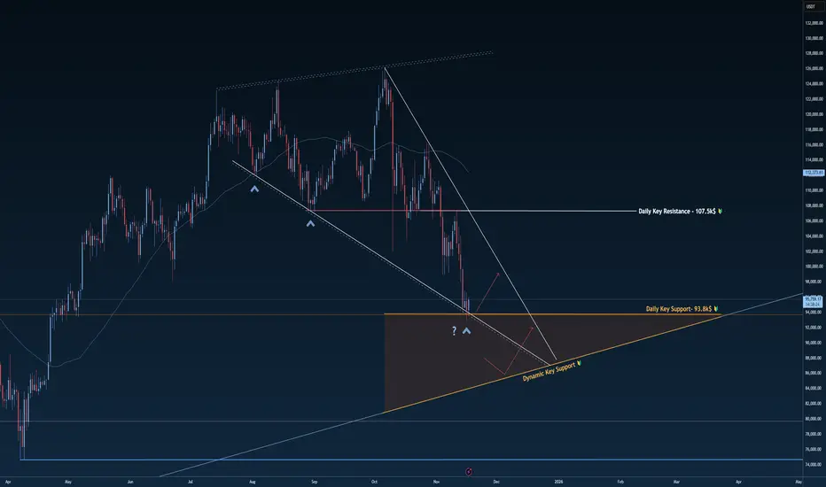 Bitcoin is currently in a weekly corrective phase within an overall uptrend, resting on a major support zone — specifically the key $93,800 level, along with the dynamic support positioned beneath it. If the price manages to hold and react positively from this area, it could provide a foundation for further upward targets. However, failure to maintain this support range could open the path toward lower levels, with $74,000 and even $65,000 becoming viable downside targets.