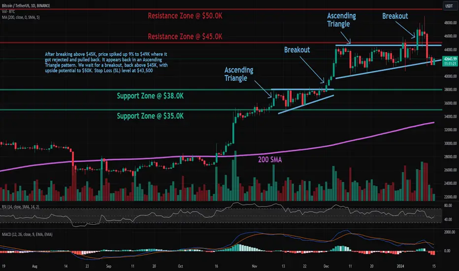 49K where it got rejected and pulled back. However, it did manage to make a Higher High and remains solidly in an Uptrend. It appears back in an Ascending Triangle pattern, giving us another opportunity. We wait for a breakout, back above $45K, with upside potential to $50K. Stop Loss (SL) level at $43,500 (just below support).