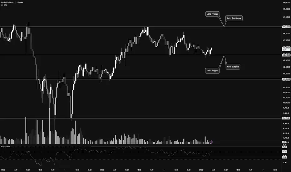 🟢 Long Scenario : A breakout above the $104,520 resistance zone, accompanied by increasing buying volume and RSI exceeding the 70 level on the 15-minute multi-timeframe, could signal a long trade.