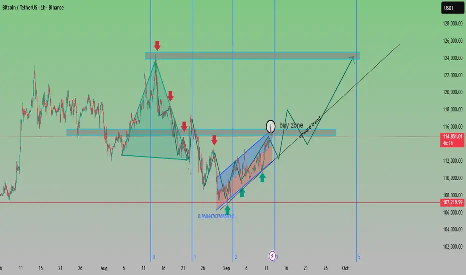 Buy Zone: Chart highlights the $114K–$116K range as a buy zone before continuation of the upward trend.