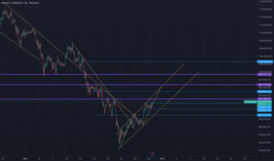 • The Pattern: We’ve got a descending resistance line connecting the lower highs since mid-November, paired with an ascending support line from the recent lows around $88,000-$90,000. This compression is typical of a falling wedge, where selling pressure diminishes, setting the stage for an upside breakout. If it holds, we could see a snap higher, similar to how these patterns resolved in past cycles.