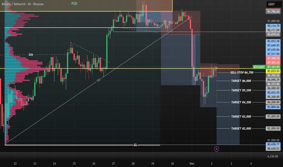 BTCUSD completed +2,000pips from my yesterdays analysis and predictions today we have price still ranging at my POC point level am looking forward to sell from 86,700 area using min confirmations under my POC key level to sell from there to 80k.....