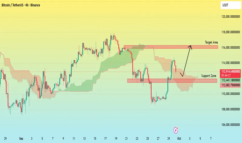 In this chart, Bitcoin is currently trading around the 113,000 USDT level after pulling back from recent highs. The price has respected the highlighted Support Zone, which is acting as a key level for buyers to step in. If momentum holds above this area, the market has the potential to move toward the Target Area near 116,000 USDT. The Ichimoku cloud indicates mixed signals, but as long as support remains intact, a push toward higher levels remains possible.