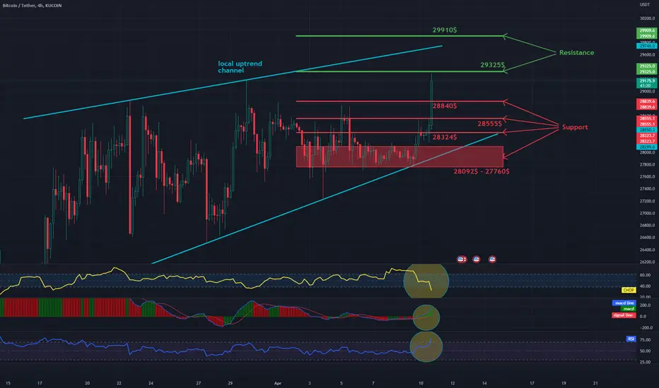 Hello everyone, I invite you to review the chart of BTC in pair USDT taking into account the interval of four hours. First, we will use the blue lines to mark the local uptrend channel where the BTC price is approaching the upper limit.