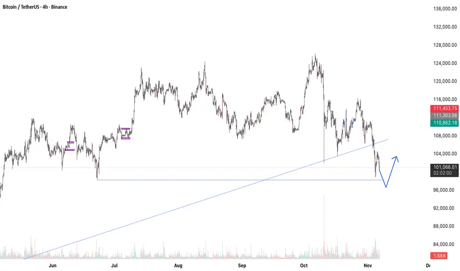 After testing the $98,000 support level, Bitcoin shows signs of exhaustion in its downward move. The long-term ascending trendline remains intact, suggesting a possible bullish reversal. If this level holds, the market could regain momentum toward $120,000 and potentially break into a new all-time high zone.