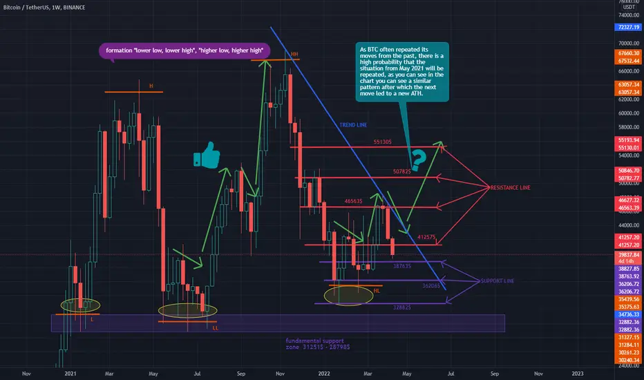 Hello everyone, let's take a look at the BTC to USDT chart. For 1 weekend interval. As you can see, the price is moving below the downtrend line.