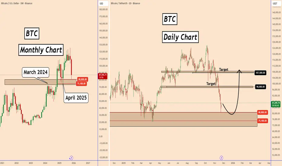 Bitcoin has reached a major long-term support zone between 75,100 – 80,800, an area that previously acted as strong support in March 2024 and April 2025 on the monthly timeframe. The current monthly candle is testing this zone again, suggesting that buyers may step in to defend this historically important level.
