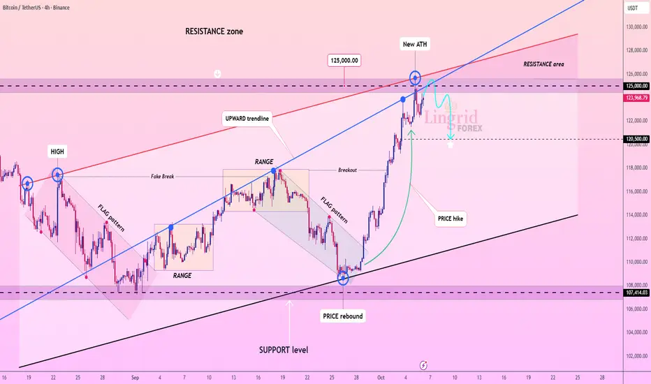 BTCUSDT is facing rejection near the 125,000 resistance after reaching a new all-time high. Price action shows exhaustion at the top boundary of the rising channel with early signs of retracement. A close below 123,000 may confirm a deeper correction toward the 120,000 support zone. Momentum suggests sellers are attempting to take control following the extended bullish rally.