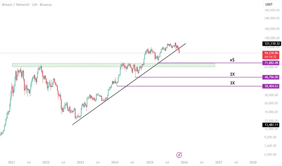 On a weekly chart, BTC has recently broken below the ascending trendline.