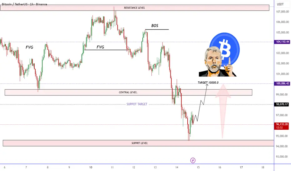 A Bitcoin price chart highlighting key ICT concepts including FVGs, BOS, support and resistance levels. The analysis suggests a potential bullish retracement from the support zone toward the central level, targeting the 100,000 USDT region. The layout shows expected price movement with marked liquidity zones and structural shifts.