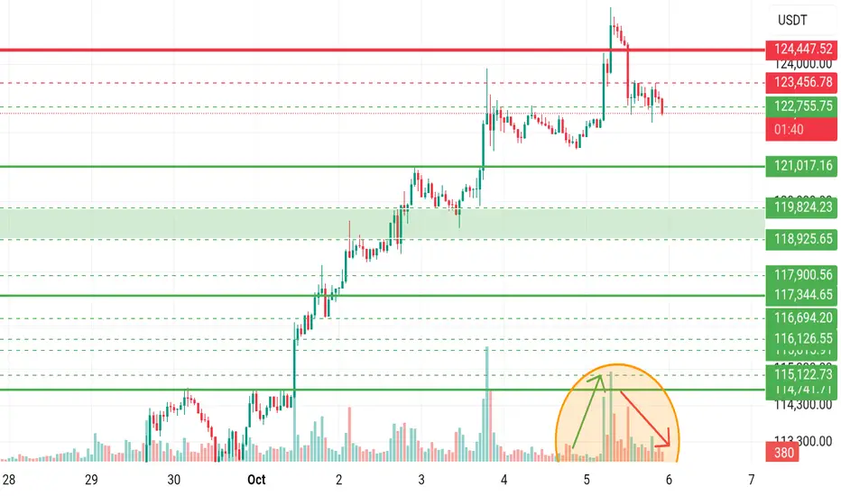 - On Oct 5, price hit a peak at 124,447.32, followed by bearish candles and a noticeable drop in volume—indicating potential exhaustion.
