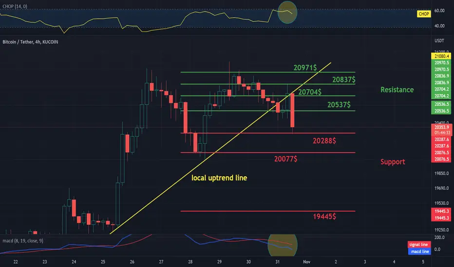 Looking at the CHOP indicator, we can see that we have a lot of energy in the 4-hour interval, and the MACD indicator shows a local downward trend.