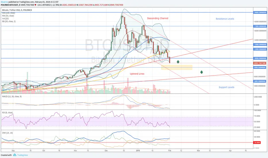 The price breaks the strong support zone formed by the uptrend line and 10000.00 support level. MACD and DMI confirm further falling. RSI drops to the oversold zone. Probably the market will be reversed at one of the possible support zones. The 1st zone is formed by the bottom line of the descending price channel and 8000.00 support level. If the price drops below, the 2nd support zone will be at the uptrend line. These 2 support zones will be good for buying based on confirmed reversal signals.