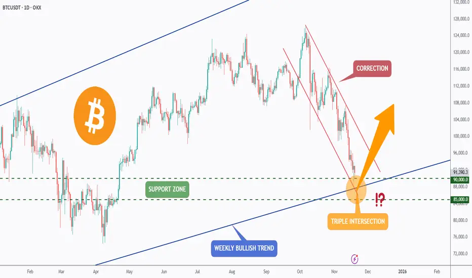 Bitcoin has been in a steep correction for weeks, sliding inside a clear falling channel. Despite the heavy sell-off, price is now approaching one of the strongest confluence zones on the entire chart, a triple intersection.