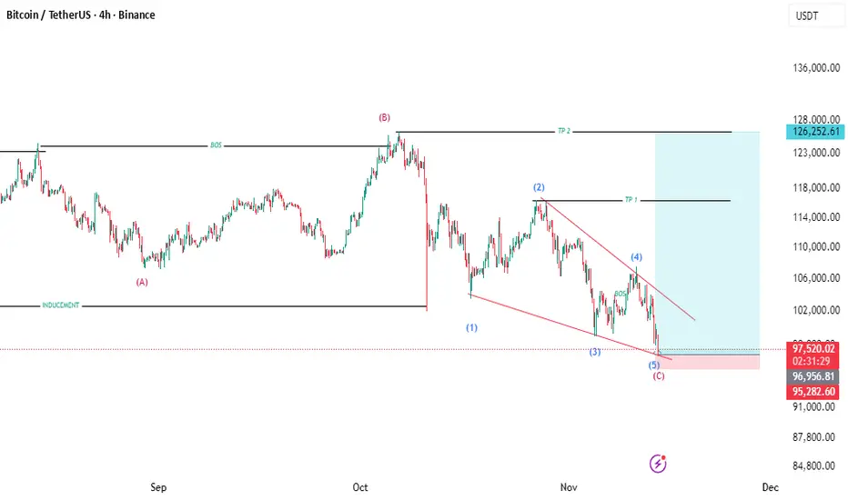Price completed an A–B–C corrective structure, with the C-wave finishing inside a descending wedge/ending diagonal.