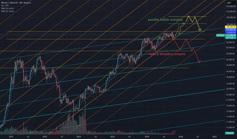 BTC price movement possible scenarios on the weekly chart. if we break below the current channel there is a possibility of a bearish head & shoulders pattern. if we break above the last ATM there is a potential bullish movement to the mid/top bands of the current channel