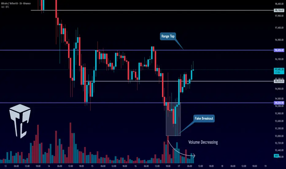 ⚡️ The 96,476 zone was faked yesterday, and after a candle closed above it, the price moved downward. Now, we need to wait for the price’s next reaction to this level to refine the exact breakout point.