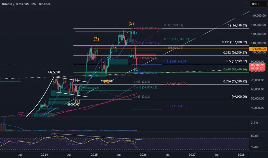 After completing a full 5-wave impulsive structure, BTC appears to have entered a corrective ABC pattern, with Wave (C) extending sharply into major support levels. Current price action is testing a powerful cluster of Fibonacci retracements and extensions, including the 1.618, 0.618, and a long-term ascending trendline.