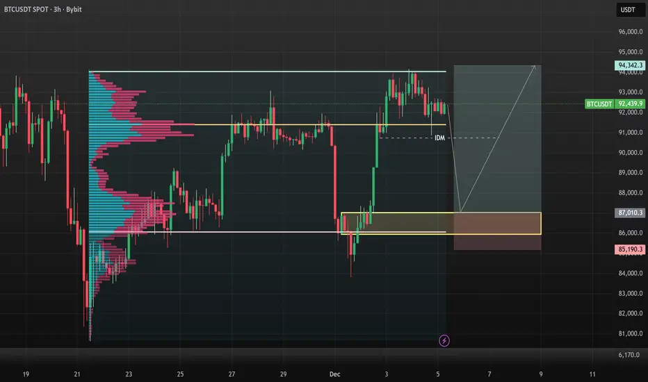 BTCUSD on the 3h chart made a fresh breakouts off the internal structure highs and also made a strong liquidity sweep off the POC level am expecting another run off liquidity from that zone to sell down to 87k for a buying opportunity 87k will be my Limit order and my VAL point of interest....