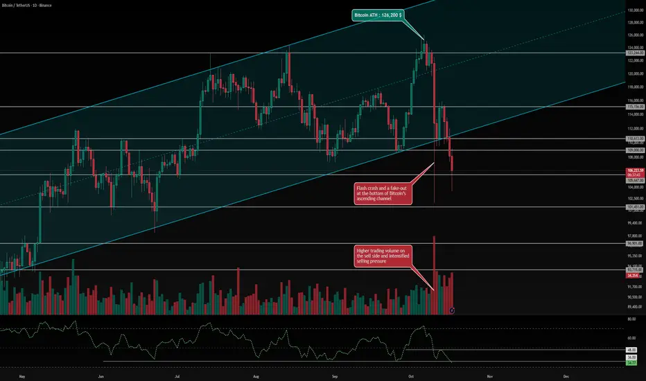 👀 Bitcoin has been trading within a strong ascending channel, recently hitting the upper boundary and setting a new all-time high (ATH) at $126,200. However, this was immediately followed by a flash crash that wiped out roughly $20 billion in futures positions. During the crash, the lower boundary of the ascending channel was also fake-broken, after which buyers temporarily pushed the price back inside the channel. Yet, due to extreme market fear and uncertainty, Bitcoin lost its key support zone at $110,613, continuing the downtrend that began with the flash crash. With yesterday’s daily candle close, Bitcoin officially broke down from its ascending channel, and price action is now heading toward lower support levels. The nearest support lies around $105,647, and if this zone fails to hold, Bitcoin could extend its decline toward the next support at $101,451.