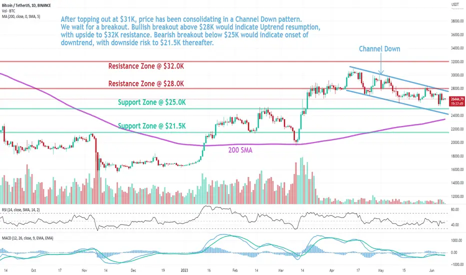 31K, price has been consolidating in a Channel Down pattern. We wait for a breakout. Bullish breakout above $28K would indicate Uptrend resumption, with upside to $32K resistance. Bearish breakout below $FWB:25K would indicate onset of downtrend, with downside risk to $21.5K thereafter.