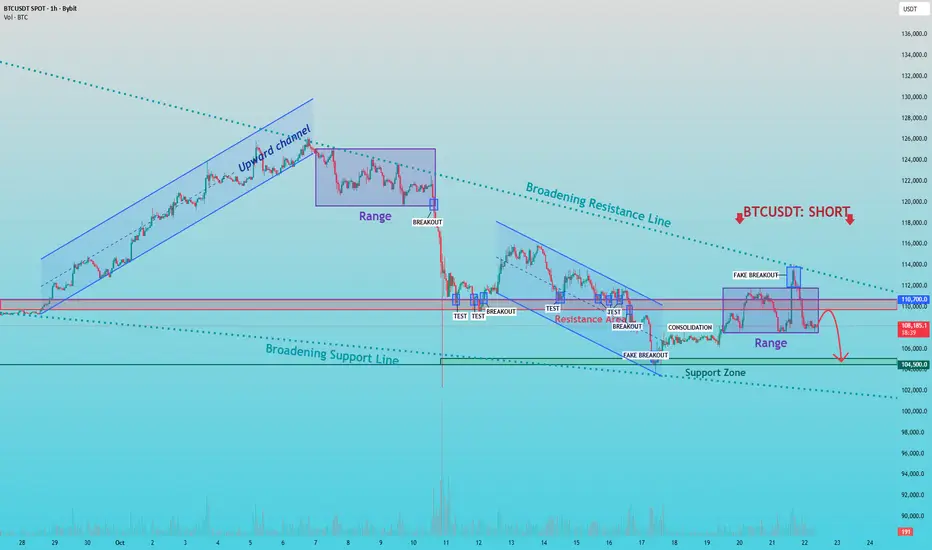 My scenario is based on the idea that the current movement is a corrective rebound within a larger bearish structure. As the price approaches the resistance area around 110,700, I expect selling pressure to increase once again. The plan is to watch how the price reacts around this resistance zone. A confirmed rejection or failure to break above this level would validate the short scenario, potentially leading to a continuation move toward the 104,500 support zone, which aligns with the lower boundary of the broadening formation.