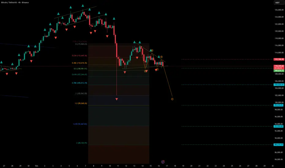 • Price failed to hold above the $112,000 resistance zone and has since formed a descending pattern, likely part of an ABC correction.
