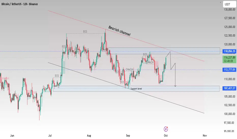 Bearish Scenario: If rejection occurs at the channel top, BTC may retrace back toward 112,777 first, with the possibility of retesting 107,400 as a deeper support.