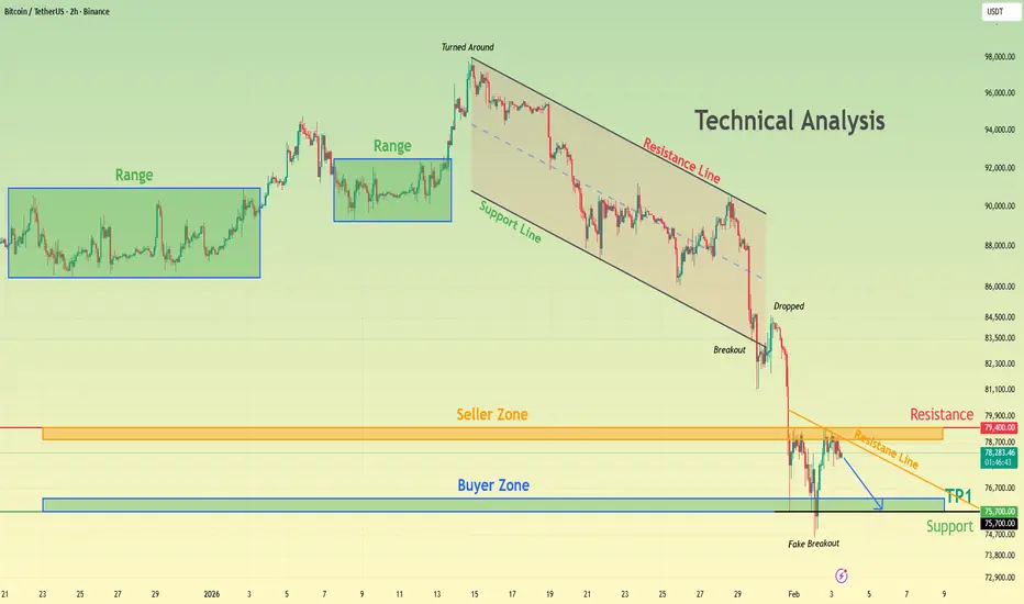 Hello traders! Here’s my technical outlook on BTCUSDT (2H) based on the current chart structure. Bitcoin initially traded within a clearly defined range, where price moved sideways for an extended period, indicating market equilibrium and accumulation before the next directional move. This ranging phase eventually resolved to the upside, leading to a strong impulsive rally and a short-term bullish continuation. However, after reaching the local top, price turned around and transitioned into a well-structured descending channel, confirming a shift in short-term market control from buyers to sellers. Following the breakdown, Bitcoin dropped sharply into the Seller Zone, where price briefly reacted before continuing lower. The sell-off eventually extended into the major Buyer Zone around 75,700, which aligns with a key horizontal support area and prior demand. Price briefly pierced this level, forming a fake breakout, but quickly recovered back above support — a strong indication that sellers failed to gain acceptance below demand. Currently, BTC is stabilizing above the Buyer Zone and attempting a short-term recovery. This price behavior suggests a corrective rebound rather than a confirmed trend reversal at this stage. Structurally, as long as price holds above the Buyer Zone, a recovery move toward the 78,700–79,400 Resistance / Seller Zone (TP1) remains possible. This area also aligns with a descending resistance line, making it a key level to watch for potential rejection. Rejection from the Resistance / Seller Zone favors continuation to the downside. A move back toward the 75,700 support is the first target, followed by potential extension toward lower demand levels if selling pressure accelerates. Acceptance below the Buyer Zone would confirm bearish continuation and open the door for deeper downside. The bearish scenario remains valid as long as price stays below resistance and fails to reclaim the broken structure. Only a strong breakout and acceptance above the Seller Zone would invalidate the short setup. Until then, BTC remains in a corrective bounce within a broader bearish structure. Please share this idea with your friends and click Boost 🚀