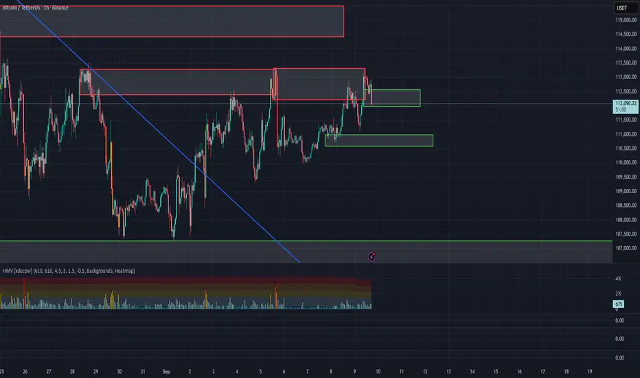 Yesterday, Bitcoin tested the previously marked sell zone at $112,200–$113,200 (volume area), where we saw only a minor reaction.