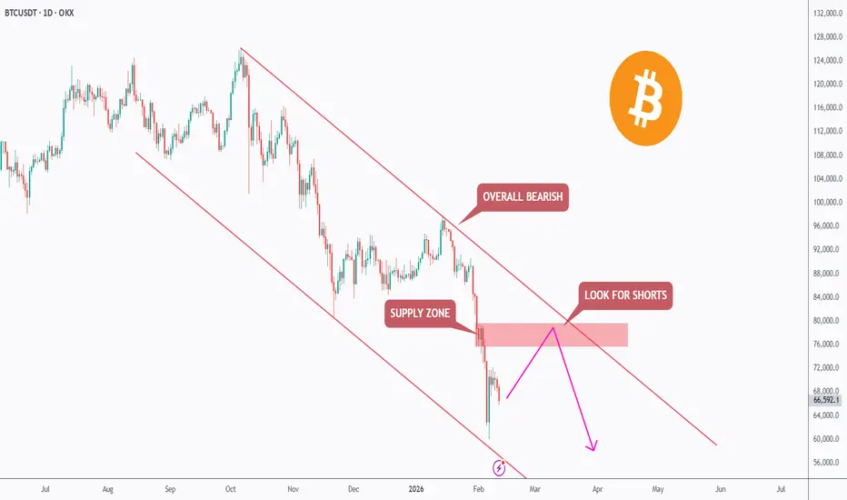 Bitcoin remains overall bearish, trading inside a clear falling channel.