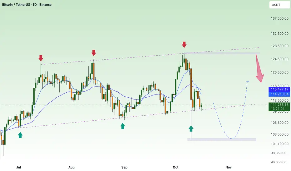 If the support holds, BTC may see a technical rebound toward the EMA89–EMA34 zone around $114,000–115,000, or even back to the channel resistance near $125,000.